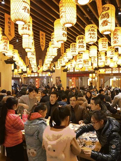 我在中午时分感受了这个店的火爆。当时是周日中午12点30分,大厅里座无虚席,一些顾客在等位,看得出来,顾客们已经习惯了在这里等待。身穿民国风服饰的服务员穿梭在熙攘的餐桌之间。大厅上方的挂满橘黄色有汉字的灯笼,让餐厅显得喜庆、温馨。
