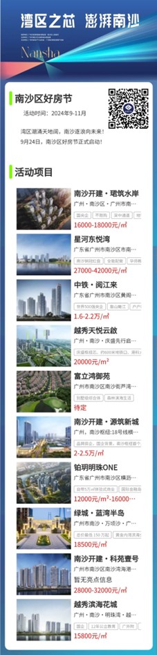 同时,南沙开建·珺筑水岸、星河东悦湾、中铁·阅江来、越秀·天悦云啟、富立鸿御苑、南沙开建·源筑新城、铂玥明珠One、绿城·蓝湾半岛、南沙开建·科苑壹号、越秀·滨海花城、中国铁建·南沙开建·西派尊府等项目在本次“好房节”活动中精彩亮相。
