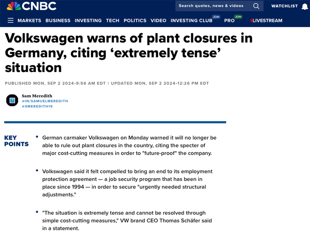 同时,大众汽车集团宣布终止一项具有30多年历史的就业保障协议,该协议原本旨在保护工作岗位直至2029年,而现在协议将在明年年中提前结束。