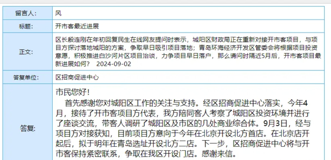 近日,有市民在青岛城阳政务网的区长信箱,咨询Costco项目最新进展时,城阳区招商促进中心答复称:9月3日,经与项目方对接获知,目前项目方意向于今年在北京开设北方首店。在北京店开起后,拟于明年在青岛选址开设北方二店。