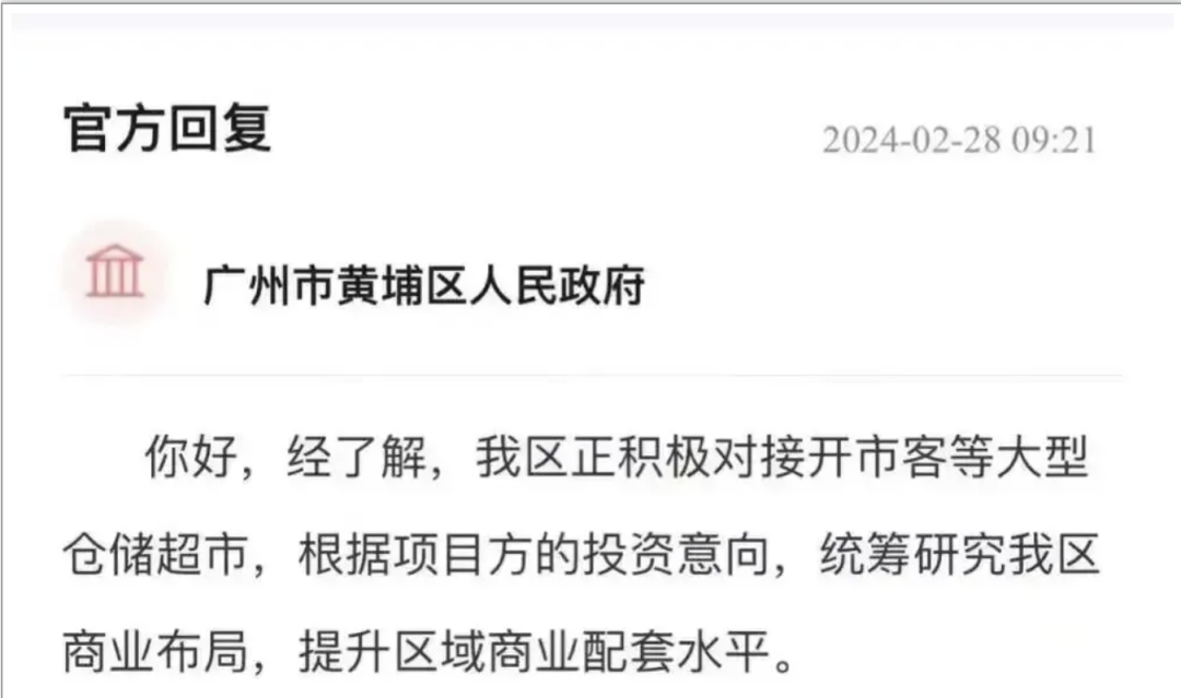2024年2月底,广州市黄埔区就曾回复市民,称正在积极对接开市客等大型仓储超市。