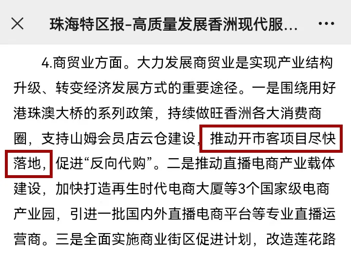 今年3月,珠海市香洲区官方也曾提出:围绕用好港珠澳大桥的系列政策,持续做旺香洲各大消费商圈,支持山姆会员店在云仓建设,推动开市客项目尽快落地,促进“反向代购”。