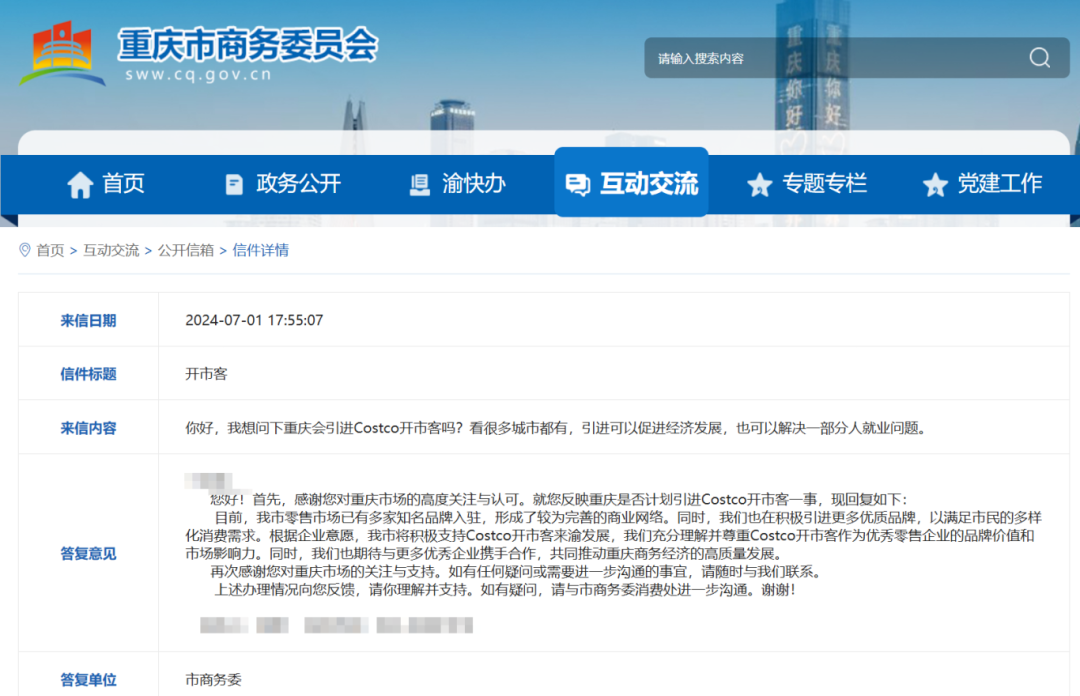 7月份,有市民提问重庆市商务委:Costco会在重庆开店吗?回复表示:目前,根据企业意愿,重庆市将积极支持Costco来渝发展,充分理解并尊重Costco作为优秀零售企业的品牌价值和市场影响力。