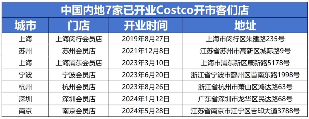 2019年8月进入中国市场以来,Costco已在中国内地的6个城市,布局7家门店,分别为上海闵行店、上海浦东店、苏州店、宁波店、杭州店、深圳店、南京店。