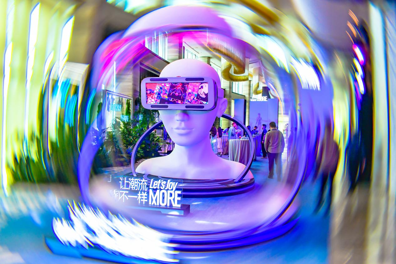 首先位于迎宾处的「科技娱乐LET’S VIBE MORE」,以巨型AI科技Miss JOY雕塑装置佩戴未来VR屏幕眼镜的形式拉满现场的未来先锋感,伴随着AI Miss JOY欢迎语的响起,一场沉浸式的跨时空科技体验即将开始。