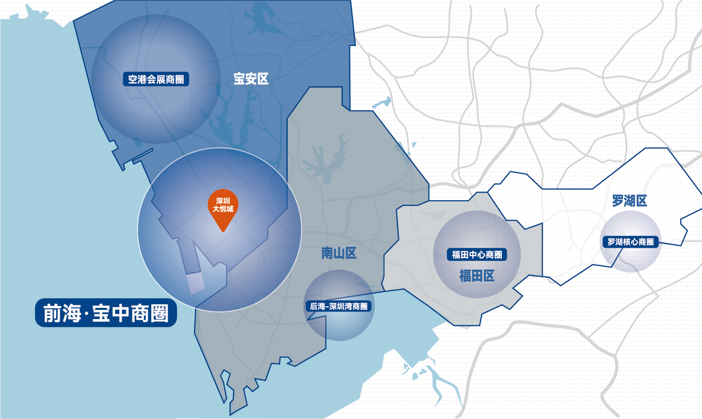 深圳大悦城地处粤港澳大湾区核心,紧邻前海自贸区,位于世界级地标商圈--前海宝中商圈中心,雄踞“湾区商务大道”创业二路黄金主轴。宝安中心商圈于2023年7月25日入选首批深圳市级示范特色商圈和夜间经济示范街区,其所处的前海宝中商圈在《深圳市商业网点规划(2023-2035)》中被列为重点打造的世界级地标商圈,尽享政策红利,未来发展前景广阔。
