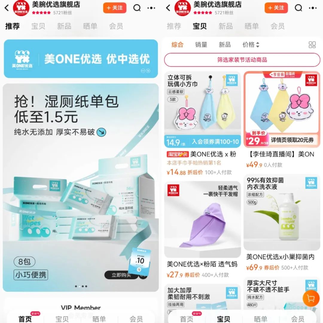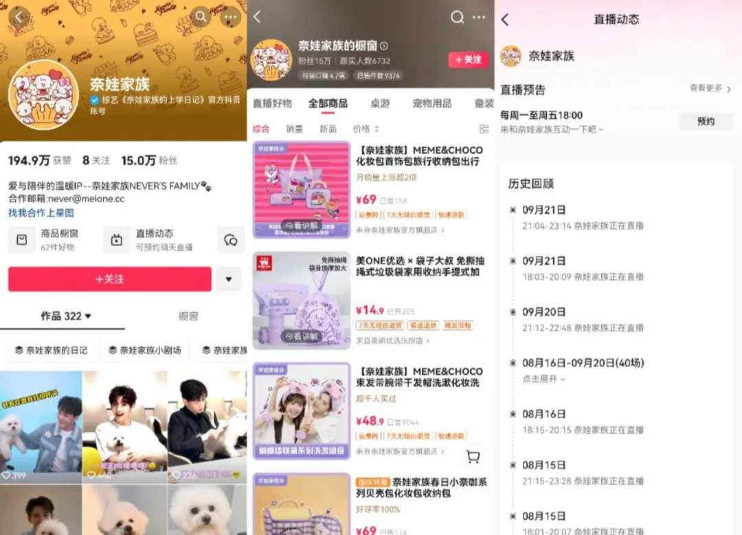 从“奈娃家族”的抖音主页来看,从每周一到周五几乎保持着一天一播的节奏,每场直播持续在2-4个小时左右,上架商品均为奈娃家族的周边产品,如手机壳、干发帽、粉扑等日用产品,尚未扩展到其他第三方产品。其中销量最高的是售价48.9元的干发帽洗漱组合,已售出超过9000件,其他均未过千。