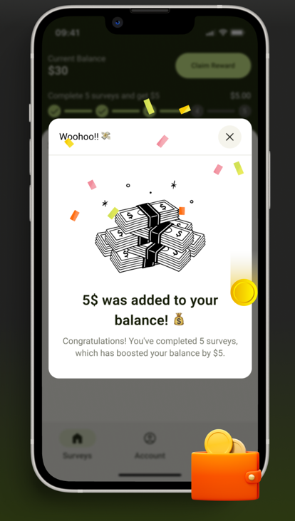 按照Five Surveys的机制,需要完成5份完整的调查才能获取5美元的奖励,且只能累计,并不能按照1份1美元去折算提现。应用中会通过显示进度条的方式激励用户,而被迫退出调查的并不算在内,这一方式也让用户十分苦恼。