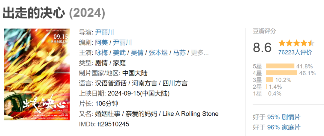 影片中,一个女人一次次想要逃离家庭,但直到年过半百才终得成行,于传统观念对女性的成长规训而言,这无疑是一种剧烈的精神反叛。豆瓣上,7.6万网友为该片打出8.6的高分,这部改编自真实事件的影片,让观众看到一种不加粉饰的、贴近大多普通女性的生存状态,结局抛掉过往的出走,更是大银幕上少见的答案。