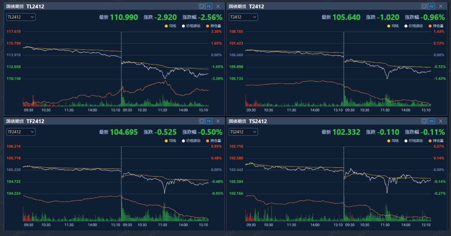 截至收盘,国债期货全线收跌,30年期主力合约跌2.56%,盘中一度跌超3%,为历史最大跌幅。此外,10年期主力合约跌0.96%,5年期主力合约跌0.5%,2年期主力合约跌0.11%。