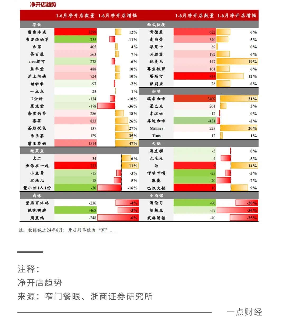 平价餐饮却仍在大量开店。浙商证券研究报告显示,2024年上半年蜜雪冰城、塔斯汀、萨莉亚等品牌正在快速开店,其中蜜雪冰城净开店3299家,同比增长12%;塔斯汀净开店814家,同比增长12%;萨莉亚净开店28家,同比增长6%。