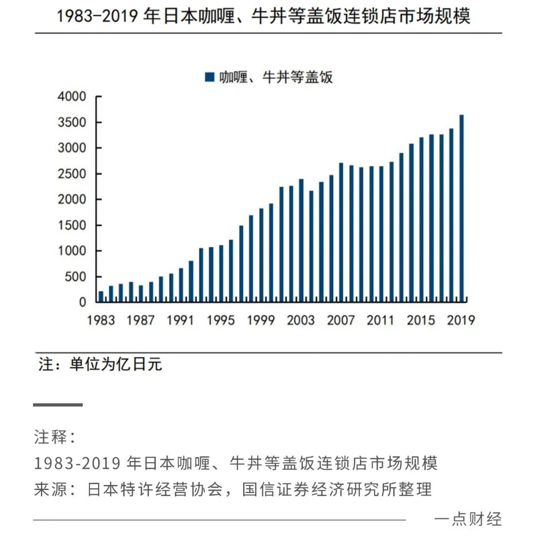从行业来看,价格更便宜的日式快餐快速增长。国信证券研报显示,1997-2011年,家庭餐厅、居酒屋、咖啡的规模分别缩小约16%、20%、20%,而快餐赛道逆势增长约49%。其中,2000-2011年,牛丼饭和回转寿司的规模增长约83%、80%(CAGR约6%、5%)。