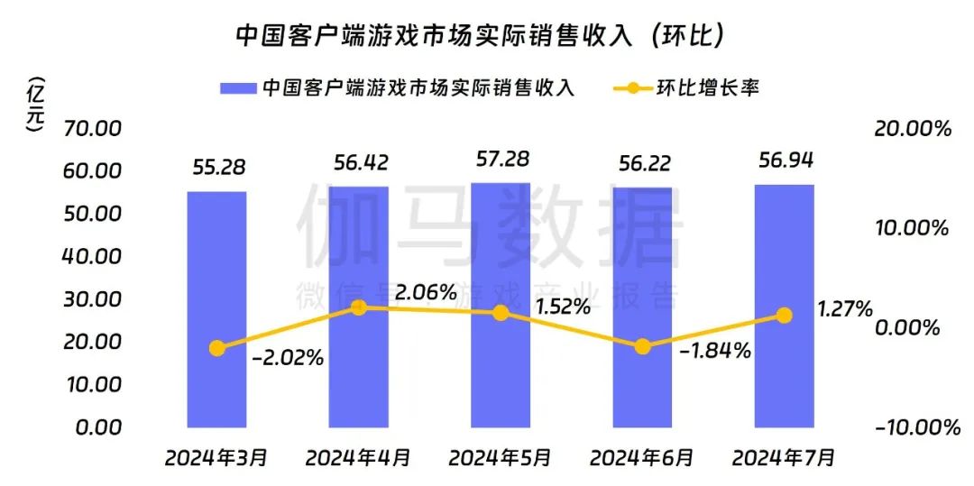 2024年7月,中国客户端游戏市场实际销售收入达56.94亿元,环比上升1.27%,运营活动与新品带来增量,同比下降0.03%。