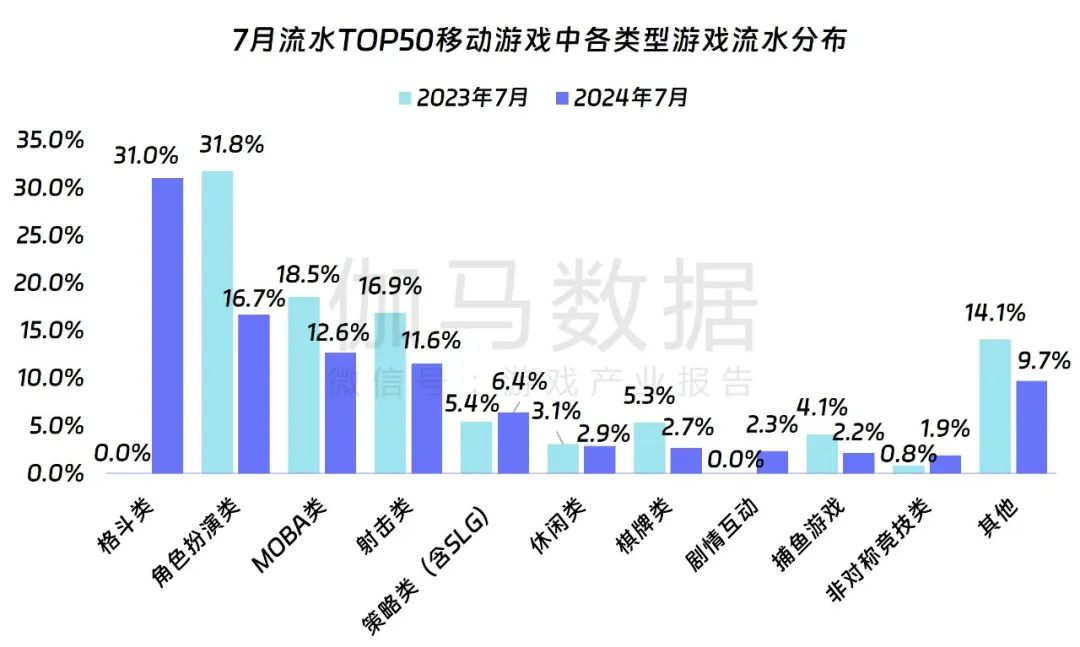 2024年7月,格斗类产品流水份额同比增长幅度最大;角色扮演类产品流水份额明显下降。