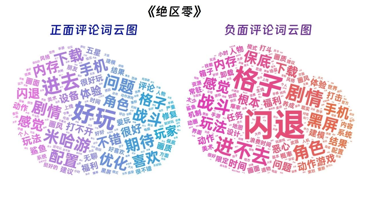 注:正面评论为用户评分4~5的评论,负面评论为用户评分1~3的评论;图中内容为单词筛选后呈现结果。
