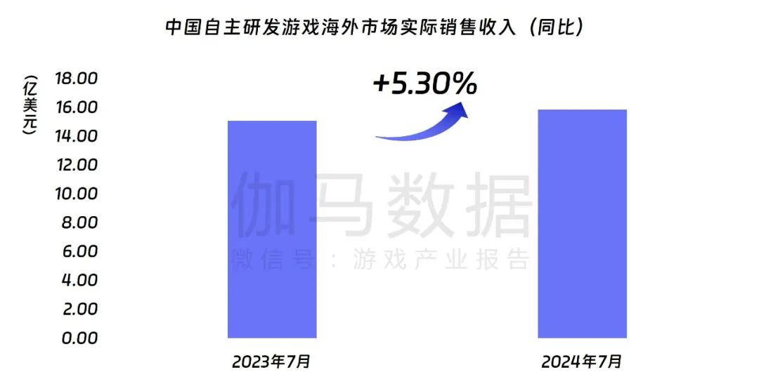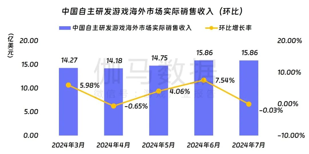 2024年7月,中国自主研发游戏海外市场实际销售收入为15.86亿美元,环比下降0.03%,同比增长5.30%。