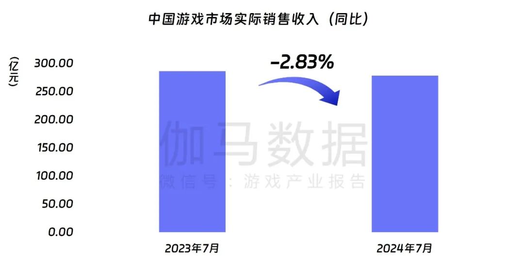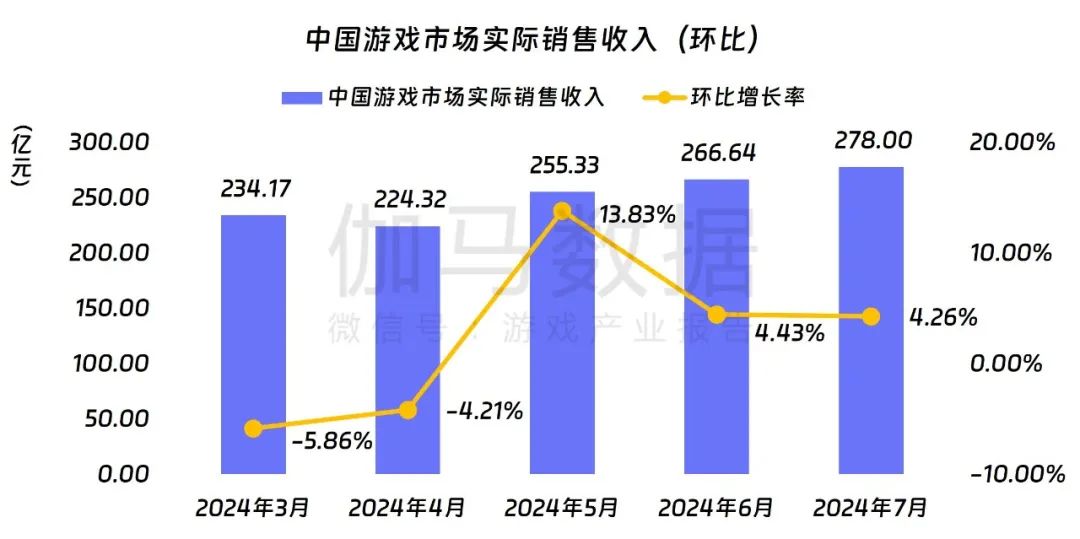 2024年7月,中国游戏市场实际销售收入278亿元,环比增长4.26%,同比下降2.83%。市场规模连续3个月保持环比增长,本月市场规模为近5个月最大值。