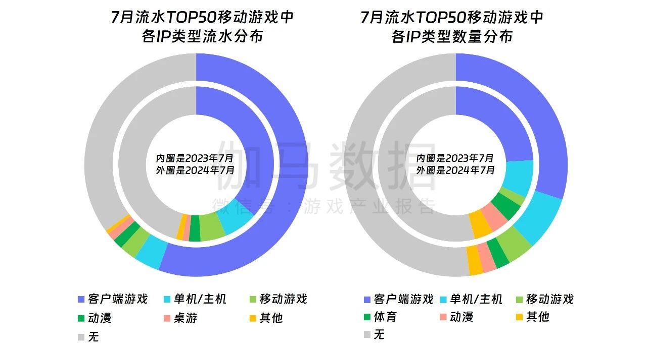2024年7月,流水TOP50移动游戏中客户端游戏IP改编产品流水份额明显增长主要受《地下城与勇士:起源》《永劫无间》等新品的带动。