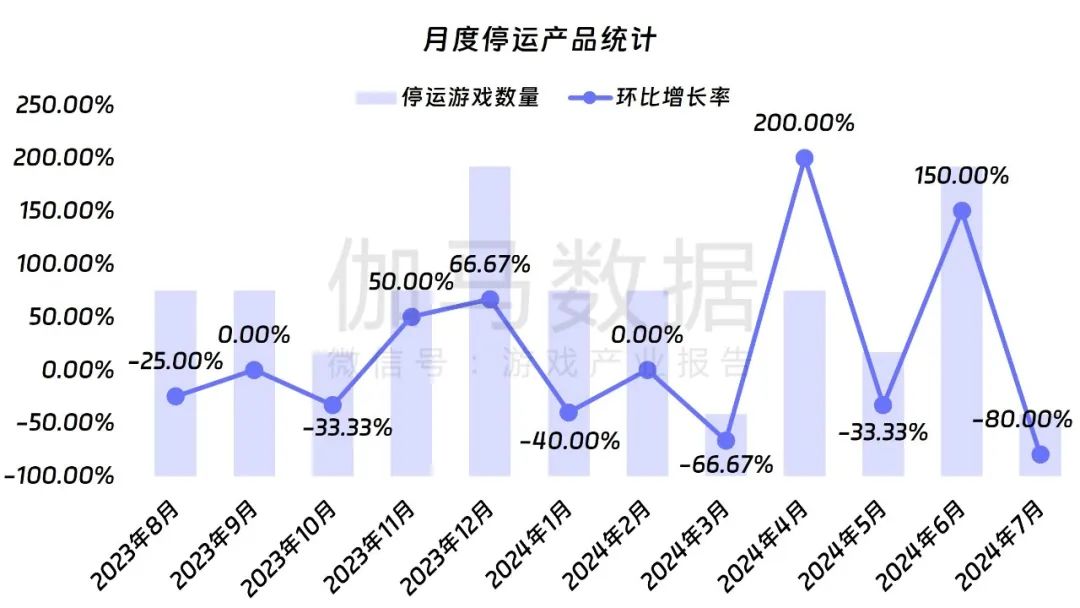 2024年7月,移动游戏产品停运数量环比下降80%。停运产品中,个别产品上线仅一年多便宣布停服。