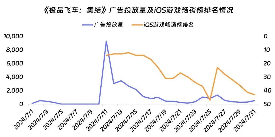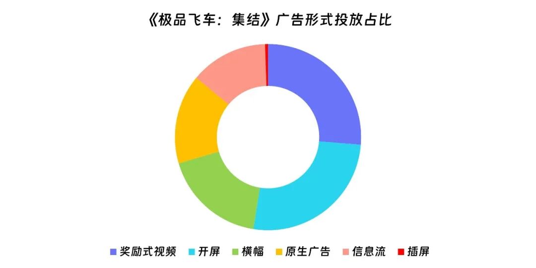 《极品飞车:集结》的广告投放主要集中于上线当日,随后投放力度骤减,游戏上线后最高进入iOS游戏畅销榜TOP12,在7月26日再次迎来回升。产品的广告形式以奖励式视频和开屏广告为主,二者占广告投放量的52.5%。