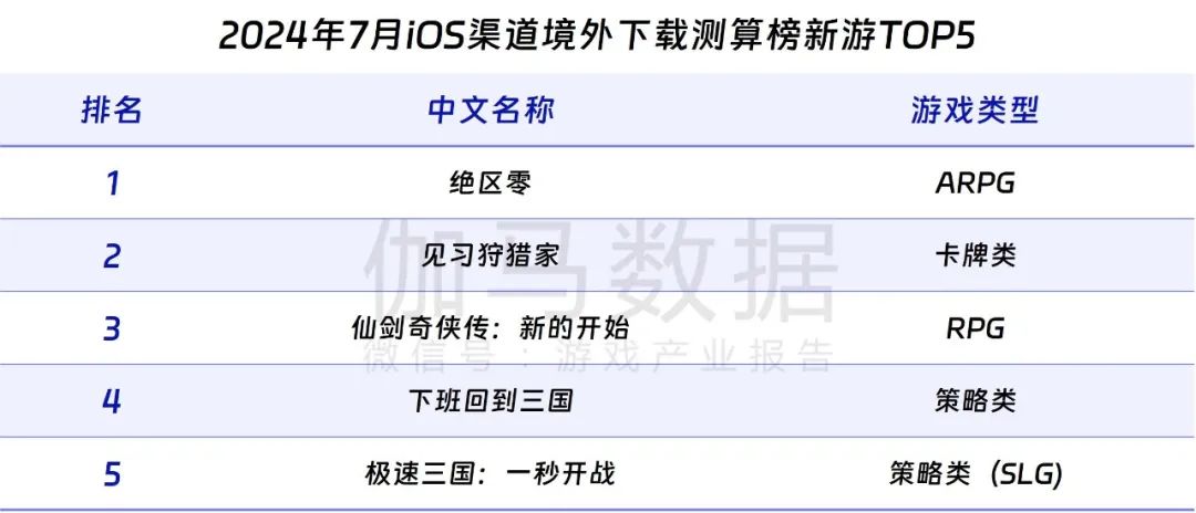 2024年7月,iOS渠道境外下载测算榜新游TOP5中,《绝区零》表现最佳,卡牌类产品《见习狩猎家》位列第二。