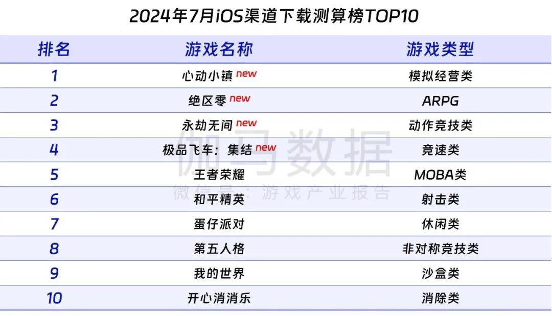 2024年7月iOS渠道下载测算榜TOP10中,前四名均为本月新游,其中《心动小镇》登顶榜单。
