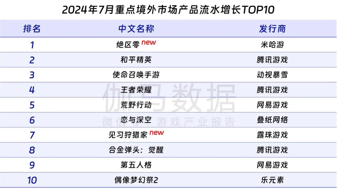 2024年7月重点境外市场产品流水增长TOP10中,新品《绝区零》登顶,游戏在境外多个市场均有较优的市场表现,开服首日便进入中国香港、中国台湾省、日本、韩国等地iOS畅销榜TOP10。