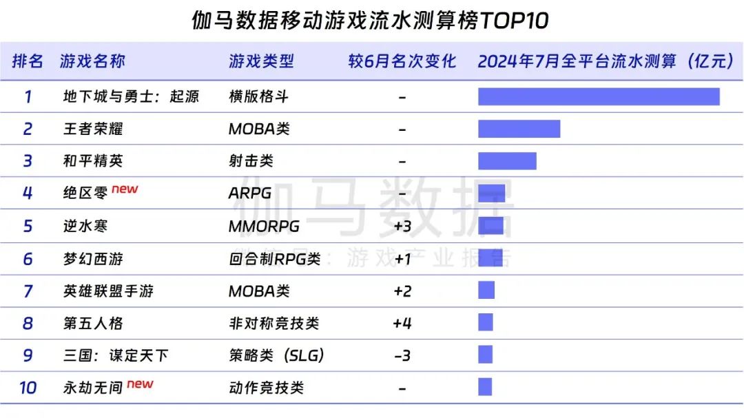 2024年7月,伽马数据移动游戏流水测算榜TOP10中,仅一款产品排名下降,《地下城与勇士:起源》登顶榜单,两款新游入榜。
