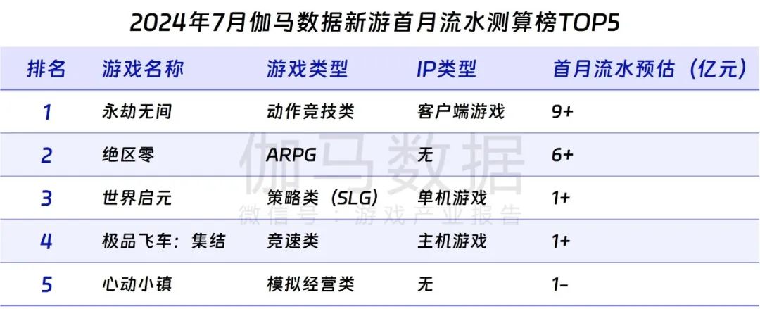 2024年7月,伽马数据新游首月流水测算榜TOP5中,《永劫无间》取得第一名,共4款产品首月流水预估过亿。