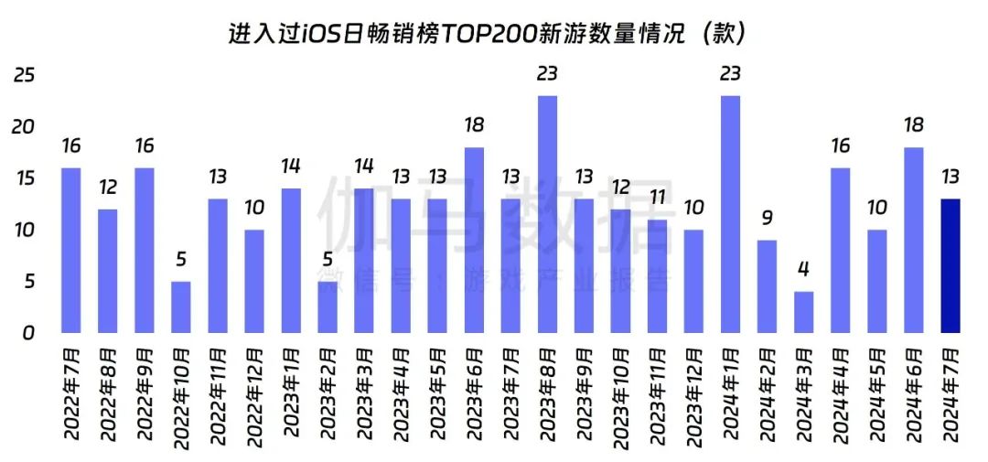 2024年7月,进入过iOS日畅销榜TOP200的新游数量为13款,数量较上月少5款,与去年同期持平。