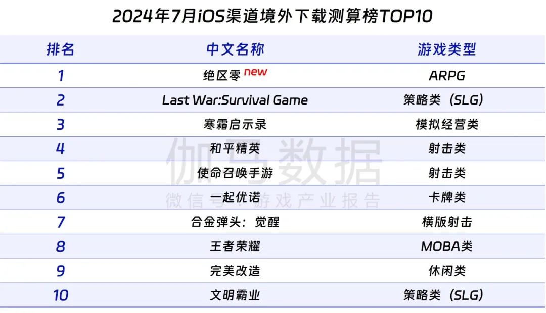 iOS渠道境外下载测算榜TOP10:《Last War:Survival Game》表现稳定《王者荣耀》首月下载表现佳