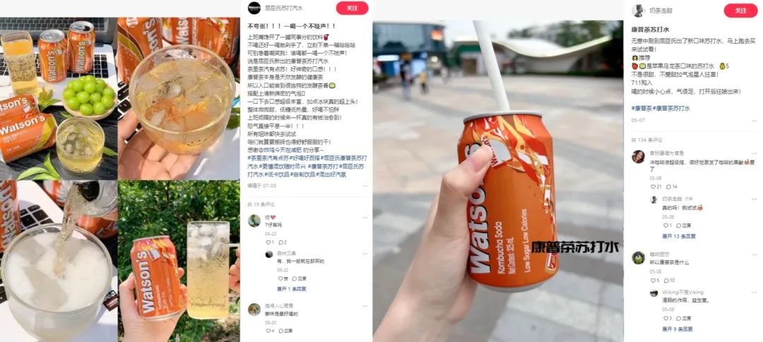 在盒马鲜生小程序上,康普茶月销量高达2000+。屈臣氏推出“茶里茶汽”的康普茶苏打汽水,在小红书等社媒平台破圈,搭配咖啡、调鸡尾酒,成为夏日调饮标配。