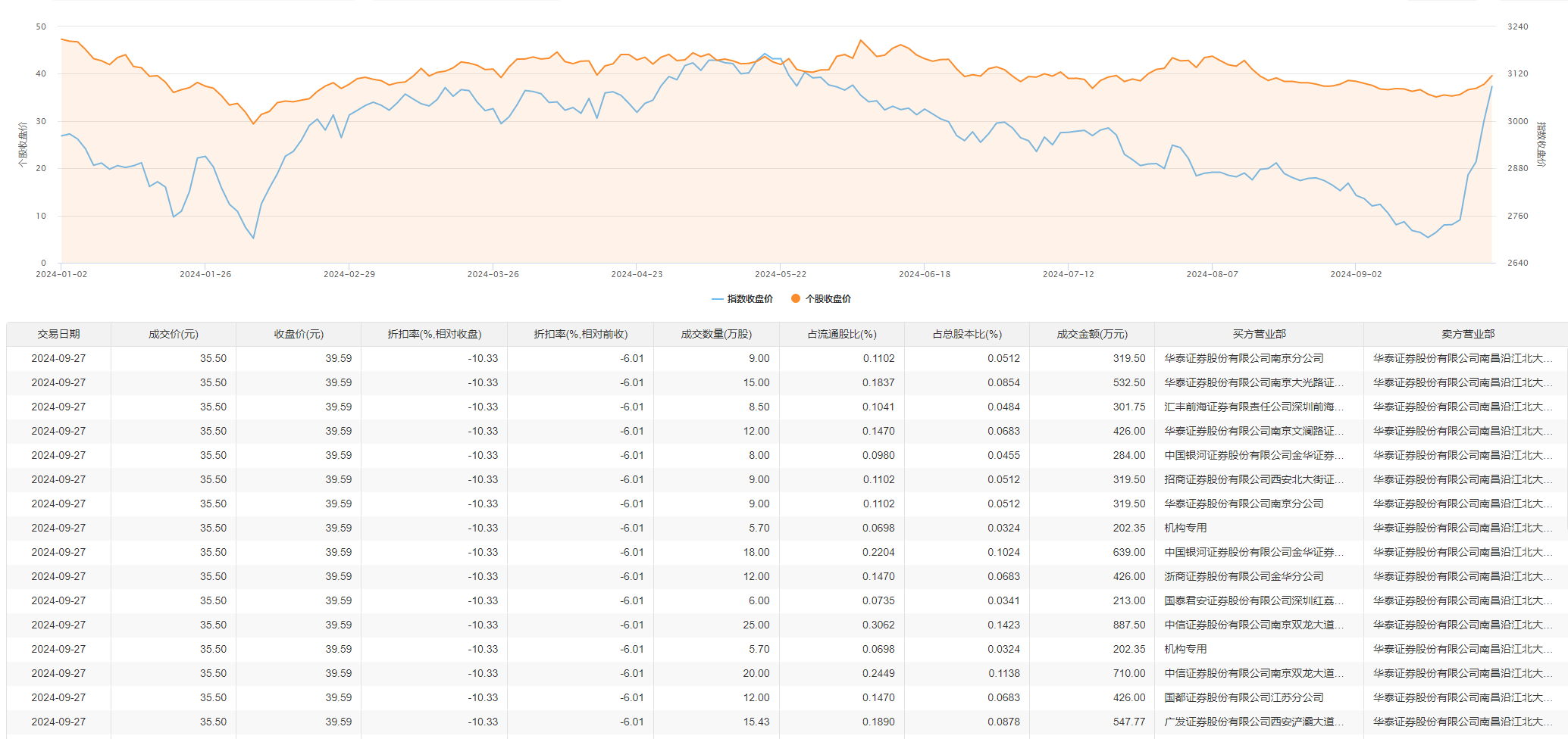 国科军工9月27日大宗交易成交190.33万股,成交额6756.72万元,占当日总成交额的46.09%,成交价35.5元,较市场收盘价39.59元折价10.33%。