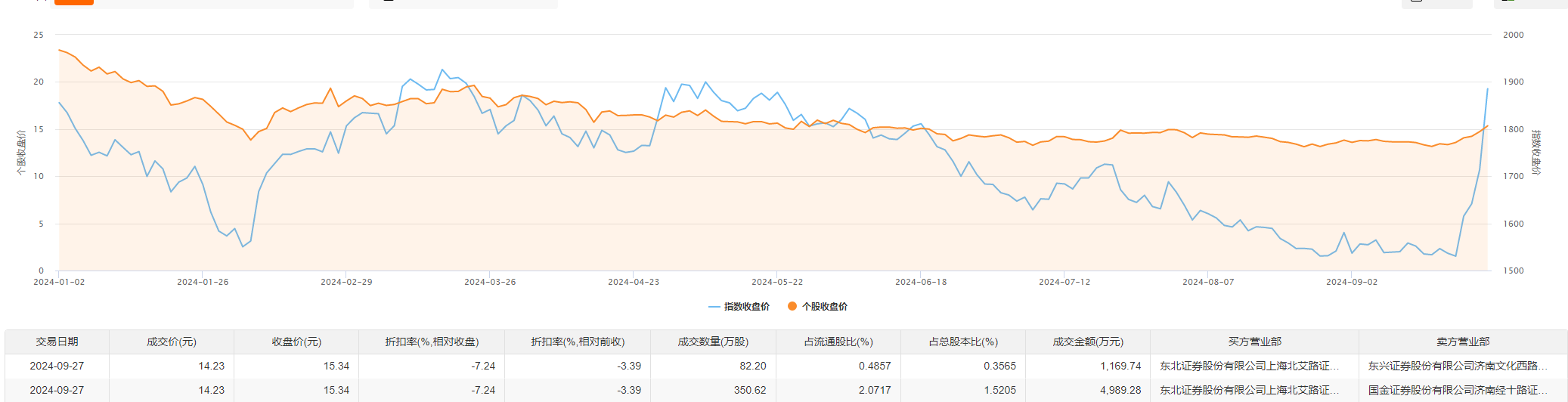 海晨股份9月27日大宗交易成交432.82万股,成交额6159.02万元,占当日总成交额的48.57%,成交价14.23元,较市场收盘价15.34元折价7.24%。
