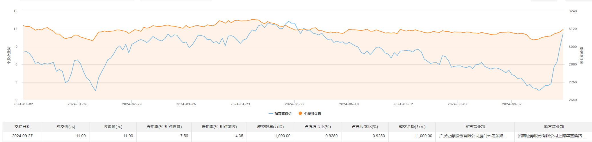 龙净环保9月27日大宗交易成交1000万股,成交额1.1亿元,占当日总成交额的56.8%,成交价11元,较市场收盘价11.9元折价7.56%。