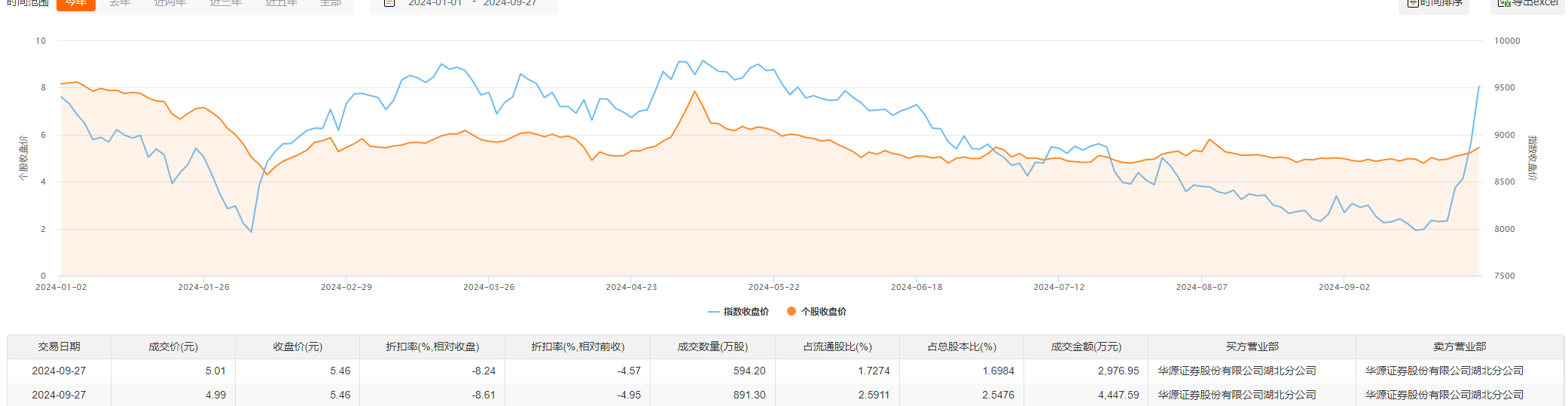 广济药业9月27日大宗交易成交1485.5万股,成交额7424.54万元,占当日总成交额的62.81%,成交均价5元,较市场收盘价5.46元折价8.42%,其中最高成交价5.01元,最低成交价4.99元。