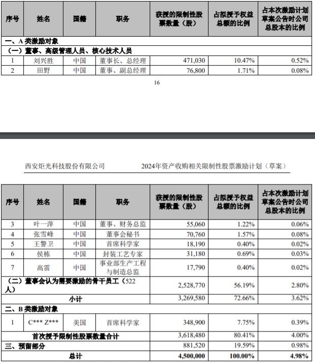 9月26日,炬光科技公告,公司发布2024年资产收购相关限制性股票激励计划(草案)。该计划拟向激励对象授予限制性股票450.00万股,约占公司总股本的4.98%,授予价格为44.26元/股。本次激励计划拟首次授予A类激励对象529人,为公司董事、高级管理人员、核心技术人员及骨干员工;B类激励对象1人,为公司首席科学家,技术带头人。