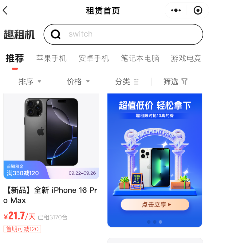 从产品页来看,趣租机的入口在“我的钱包”里,提供包含电脑、手机、VR眼镜等产品在内的租赁服务,模式为“以租代购+到期送”。连线Insight观察到,趣租机业务之下,全新iPhone16promax手机仅需21.7/天,目前已租3170台。
