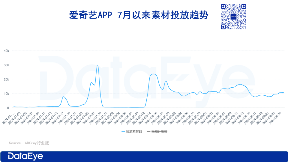 根据ADXray行业版,爱奇艺2024年Q3投放了超26万组素材。8月中旬以来,爱奇艺日均投放素材量超1万组。但是,爱奇艺投放的素材主要和长剧相关,短剧相关素材不到100组。