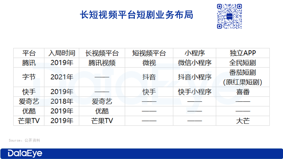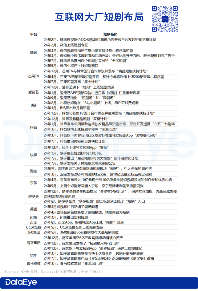 DataEye研究院整理了2023年12月以来,各大互联网平台短剧业务布局,见下表: