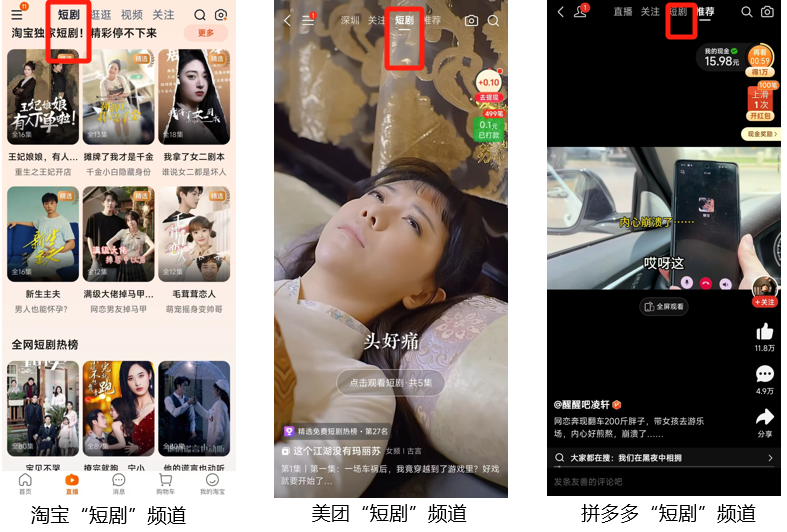 今年来,淘宝、拼多多、美团等电商巨头都不约而同盯上了短剧这块蛋糕,这体现为旗下APP纷纷新增“短剧”频道。