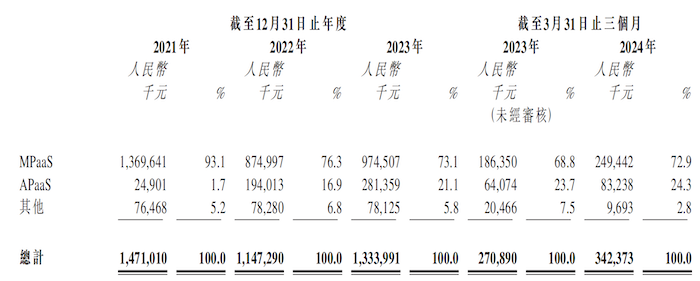 除此之外,公司的收入也表现不佳,报告期分别为14.71亿元、11.47亿元、13.34亿元和3.42亿元。虽然APaaS服务收入提升显著,但MPaaS业务收入同时也在大幅下滑。