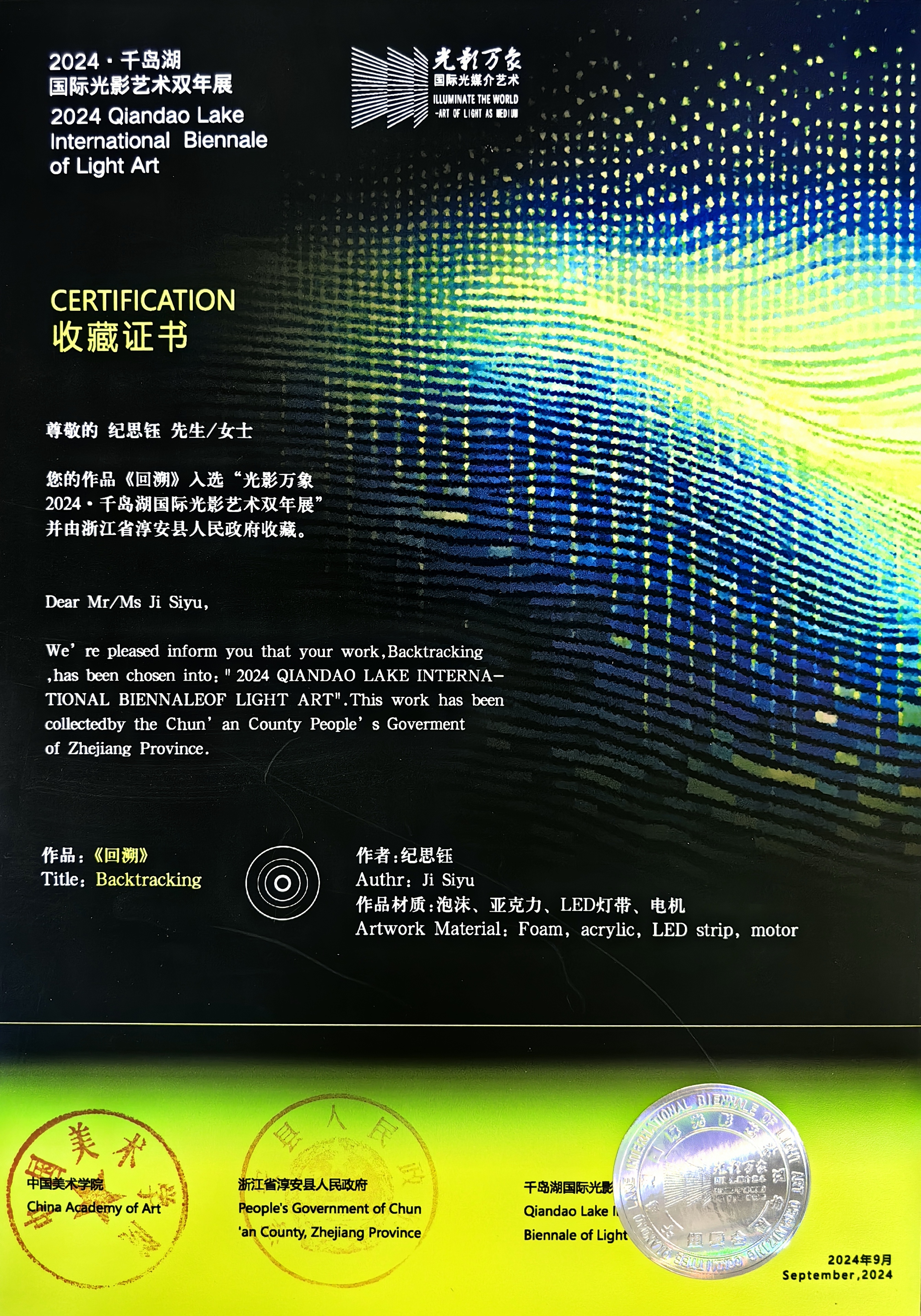 “艺术遇见科技,我看到了奇妙的‘火花’。”“太震撼了!作品真的很有故事感!”……近日,宁波财经学院艺术设计学院教师纪思钰凭借作品《回溯》,在全球8个国家合计200余件投稿方案中脱颖而出,入选第二届千岛湖国际光影艺术双年展。