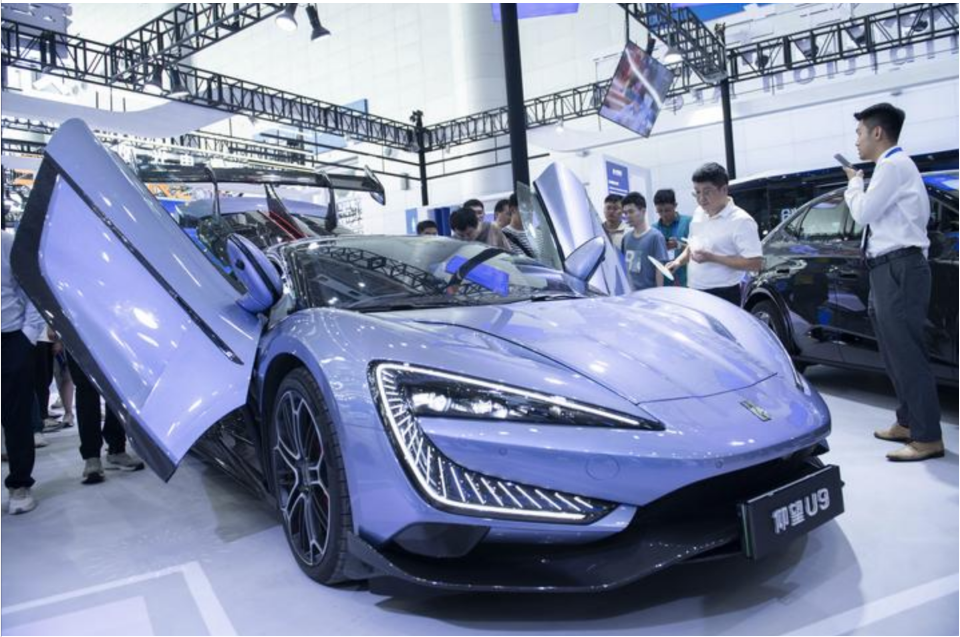 鹰眼大灯、夸张的尾翼配合流线型车身,一款比亚迪的电动超跑在展台上摇摆“蹦迪”。