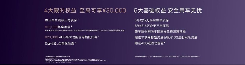 与此同时,在2024年10月31日前(含),下定用户可享受4大限时权益,至高可享30000元。包括首任车主终身三电质保、10000元尊享套装、20000元ADS高阶功能包等额抵扣券、0首付起,全期限低息等。