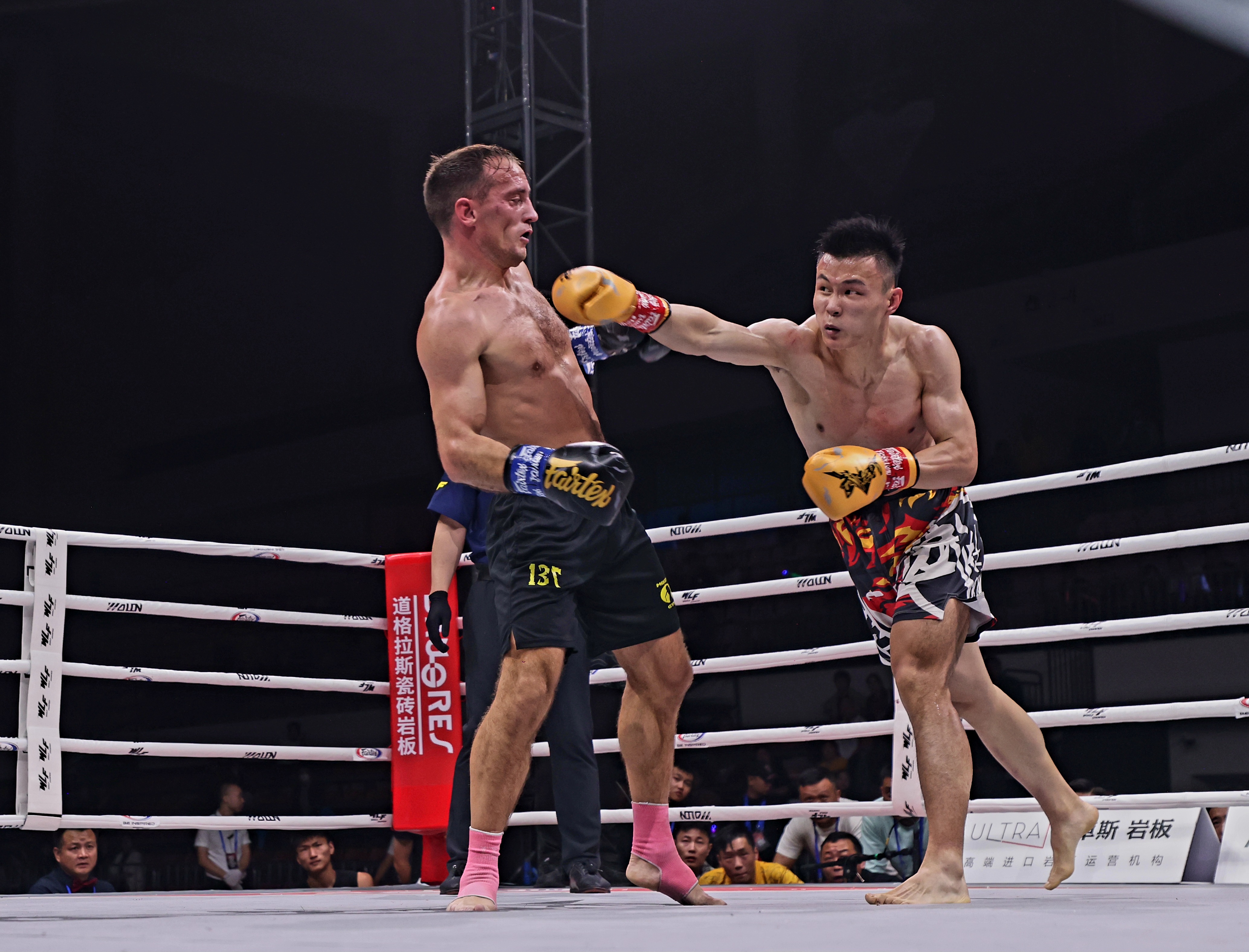 武林风世界冠军巅峰战63公斤级A组四人战同样精彩异常。首轮激战中,唐山文旅骁骑格斗进化营大将赵崇阳与西班牙选手丹尼尔·普埃塔斯之间的较量让人热血沸腾。在主场观众的加油助威声中,赵崇阳展现出强大的实力,连续打出重膝重腿,并在第二回合强势TKO对手,斩获比赛胜利。