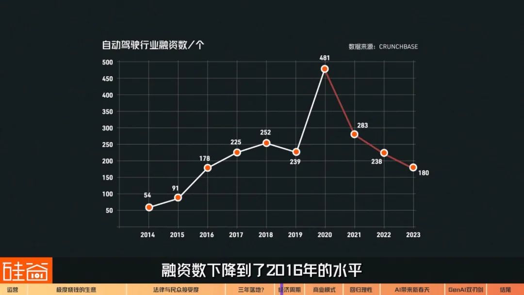 通过在crunchbase上查询的数据,自动驾驶行业在过去十年间,融资数最高的一年为2020年,然后开始逐年下降,到2023年,融资数下降到了2016年的水平。