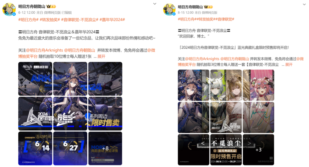 基于演唱会推出的游戏IP周边礼盒产品,同样能在官方旗舰店热卖。5月的“音律联觉”结束后,鹰角分别于6月、8月推出了两次周边限时售卖活动,产品包含演出蓝光碟、设定纪念册、相卡、收纳册、明信片、马口铁徽章等一系列音乐会周边产品。