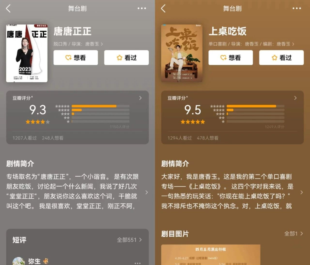 唐香玉在线下的两个专场《唐唐正正》和《上桌吃饭》的票房和口碑都相当不错,在网友统计的脱口秀线下专场豆瓣评分当中,唐香玉的这两场专场分别有9.3和9.5分,位列第七和第三。