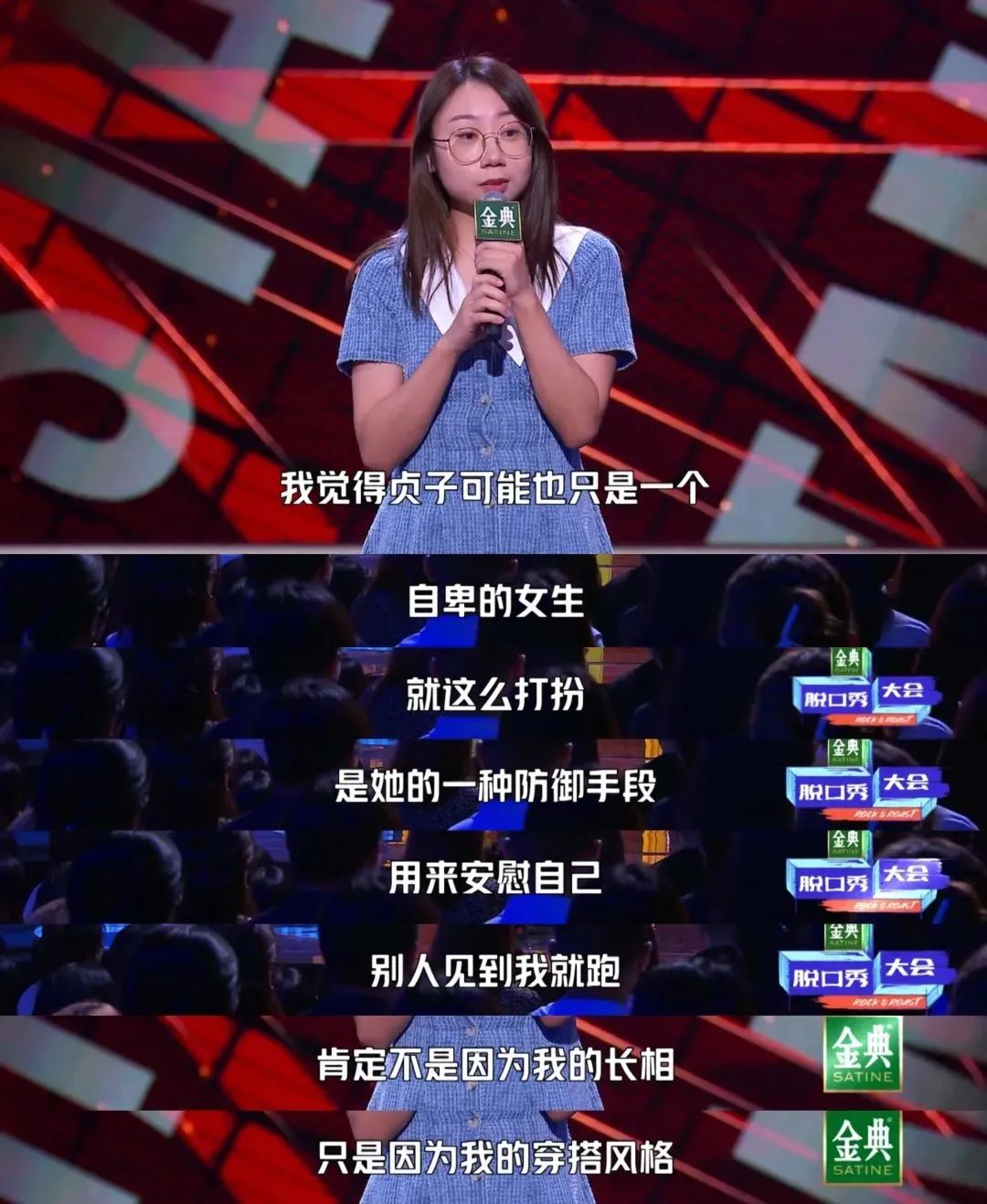 菜菜通过讲述让跑腿小哥帮忙带卫生巾的过程谈论“月经羞耻”,让陈鲁豫和网友直呼终于有选手在公开场合去聊“月经自由”了,随后,菜菜又从自己的32岁催婚经历出发讲出“毕竟男人的命也是命”这样的地狱级笑话;赵晓卉第一期讲述亲密关系的内容输给了借助PPT讲职场的Kid,让晓卉这位脱口秀演员界的知名打工人大为破防,但这也激发出了她在复活环节的超神表现,“就像男的看见卫生巾广告说我终于知道月经是蓝色的一样”引发全场高呼,之后又讲出了”父爱如山,一动不动”,大胆吐槽自己亲爹,引发了强烈共鸣;颜怡颜悦对于女孩取名的吐槽,并放出“听过唯一带动词的女孩名——招娣”这一金句;Echo聊起自己的原生家庭来,以一种客观陈述事实的讽刺感道出了多少山村里女孩成长过程的不易,“村里特别喜欢打孩子,小打吃中药,中打吃西药,大打吃农药”、“三种孩子不打:成绩好的不打,别人家的不打,儿子不打”、“在我们家,我们一定要努力才能像儿子一样看起来毫不费力”等描述把中国式农村家庭里的一些写照给带上了舞台,残酷又真实……
